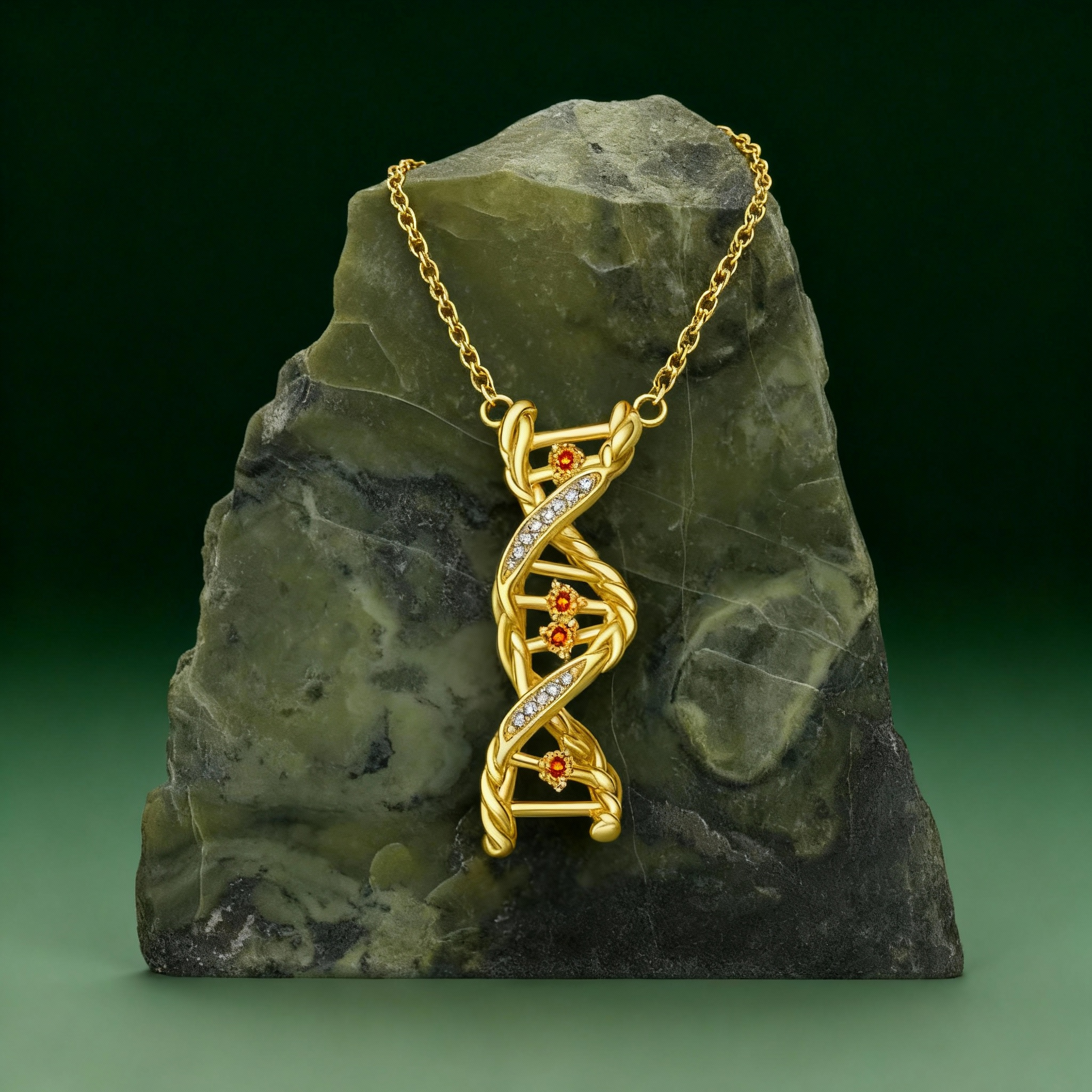 Adorned with glinting stones and warm gem accents, it’s not just jewelry: it’s a wearable symbol of uniqueness (your one-of-a-kind DNA) and the gentle growth of beauty (the vine’s quiet strength).